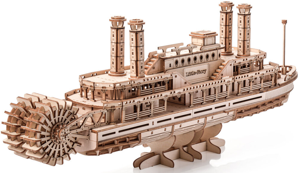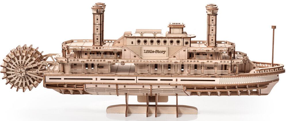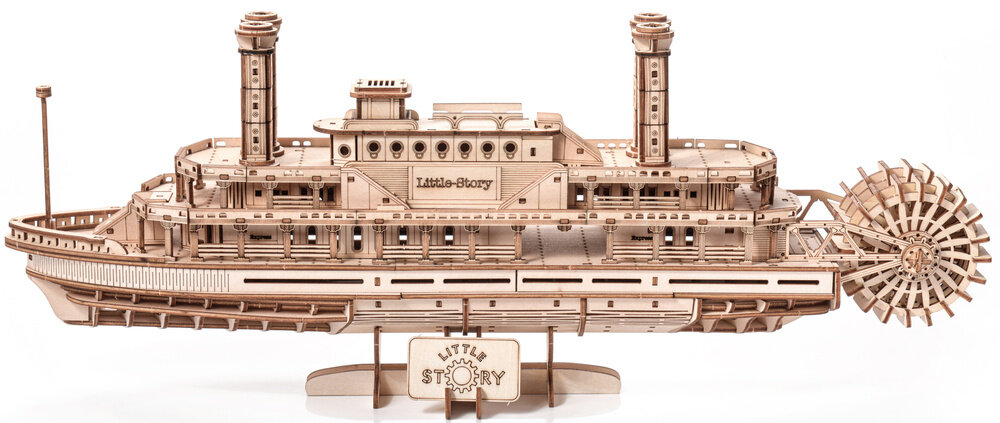 Koka 3D puzle - Steamer Little Story E025 ir elegants vēsturiska tvaikoņa modelis, kas paredzēts tehnoloģiju, kuģu un precīzi izgatavotu koka būvēšanas komplektu cienītājiem. Šis modelis nāk no Little Story darbnīcas un ir izgatavots Polijā, pievēršot maksimālu uzmanību detaļām, sākot no raksturīgā riteņa līdz reālistiski veidotajiem klājiem.